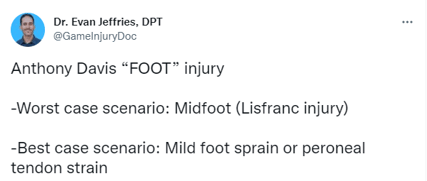 对于浓眉的伤情,医学专家Evan Jeffries推断,最坏情况是浓眉中足扭伤,最理想的情况是轻度足部扭伤或腓肌腱拉伤。