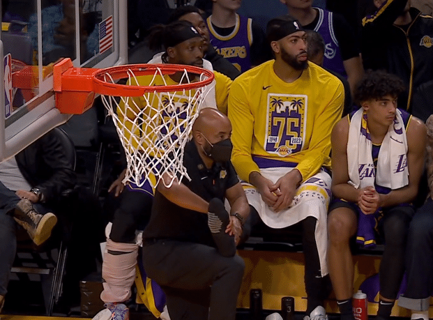 浓眉是在第一节受伤的,持球单挑约基奇,上篮时在空中踢到约基奇的身体,导致右脚受伤,一瘸一拐十分统治,第二节浓眉带伤坚持比赛,但他场上形同虚设,攻防两端都没什么表现;下半场,湖人变阵,托马斯-布莱恩特顶替浓眉首发,浓眉因右脚受伤提前退赛。