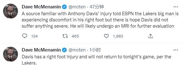 据哈姆透露,浓眉的受伤是脚部问题,浓眉在球馆中接受了X光检查,明天将会有更多关于浓眉伤情的消息;内部人士表示,浓眉的右脚感到不适,希望避免严重伤病,他将在明天接受核磁共振检查,从而进一步确定伤势。