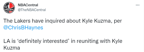 曝湖人已向奇才问价库兹马:非常有意与其重聚 但谈判没有什么结果