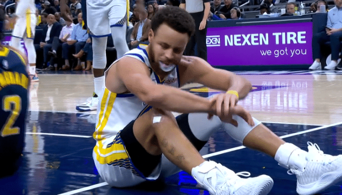 首节比赛,库里开场中投得分,迪温琴佐轰进三分,库里高抛造犯规两罚全中,之后库里迎着特纳的补防打成3+1,库里倒地伸手指庆祝;库里持球杀到禁区得分,底角三分一击即中,勇士20-11领先到9分,被步行者连得4分后科尔喊停比赛。