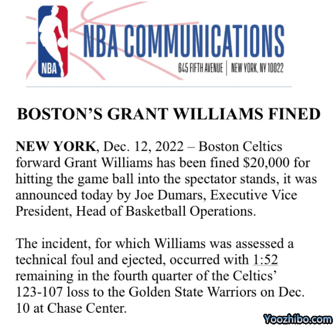 来源:JRS直播网12-13 11:53JRS直播网12月13日,NBA官方公布两笔罚单,凯尔特人悍将格兰特-威廉姆斯因把球击飞到观众席被追加罚款2万美元,老鹰球星特雷-杨因扔球庆祝被罚款2.5万美元。