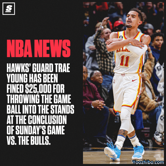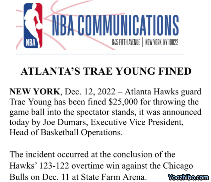 在此前老鹰和公牛比赛中,加时最后1秒上演神剧情,特雷-杨中投准绝杀,德罗赞造犯规三罚全中反绝杀,之后老鹰新秀AJ-格里芬0.5秒空接绝杀,特雷-杨拿到球之后直接将球扔飞庆祝,官方宣布特雷-杨将球扔向观众席,罚款2.5万美元。