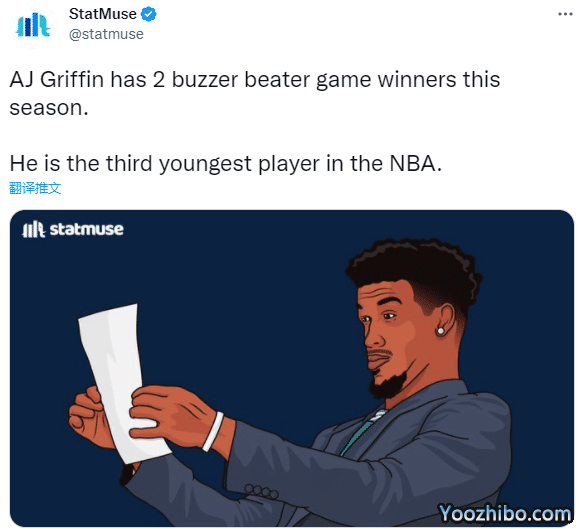 不到一个月前,在老鹰和猛龙比赛中,AJ-格里芬接特雷-杨助攻直接空接压哨绝杀;老鹰16号秀本赛季已经2次完成压哨绝杀,成为NBA历史第三年轻单赛季至少2次压哨绝杀的球员。