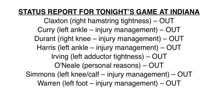 杜兰特(左膝伤病管理),欧文(左内收肌紧张)、克拉克斯顿(右腿筋紧绷)、赛斯-库里(左踝伤病管理)、乔-哈里斯(左踝伤病管理)、罗伊斯-奥尼尔(个人原因)、西蒙斯(左膝/左小腿伤病管理)和沃伦(左脚伤病管理)