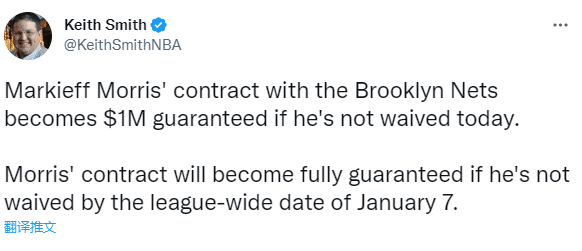 据名记Keith Smith报道,若今日不被裁,篮网球员马基夫-莫里斯的合同将得到100万美元保障,明年1月8日,他的合同将转为全额保障。