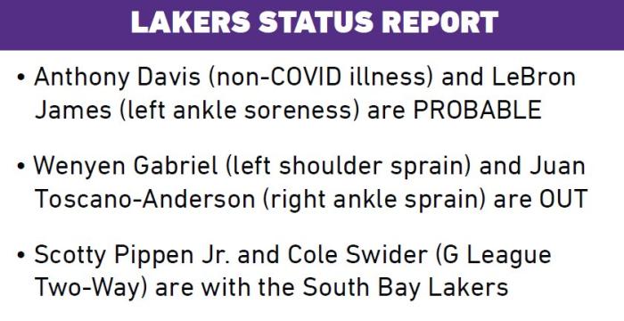 来源:JRS直播网12-09 10:08JRS直播网12月09日,湖人官方公布下一场对阵费城76人的伤情报告,詹姆斯(左脚踝酸痛)和浓眉(非新冠生病)大概率出战,75%可能性上场;加布里埃尔(左肩扭伤)和托斯卡诺-安德森(右脚踝扭伤)因伤缺席比赛,小皮蓬和斯威德跟随南湾湖人,仍旧留在发展联盟。