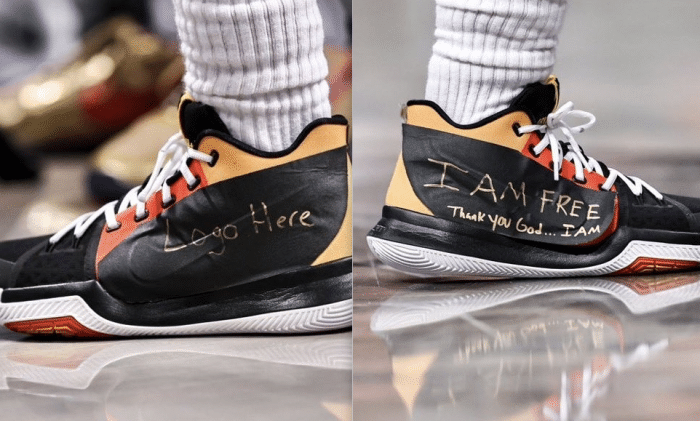 欧文曾是耐克最火的球鞋代言人之一,欧文系列的篮球鞋卖的很好,可由于场外反犹太人事件,耐克决定与欧文解约,双方分手后欧文直呼他自由了;欧文更是在比赛期间硬刚耐克,在球鞋上用黑色胶带故意遮挡耐克标志,并在左右球鞋上分别写上了“这里是Logo”、“我自由了,感谢上帝!”“我就是我”的字样。