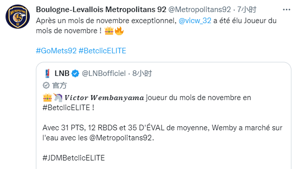来源:JRS直播网12-09 10:04JRS直播网12月09日,LNB官方公布月最佳球员,巴黎大都会92队球员文班亚马当选11月份法甲篮球联赛月最佳球员,马刺球迷希望球队能够得到他。