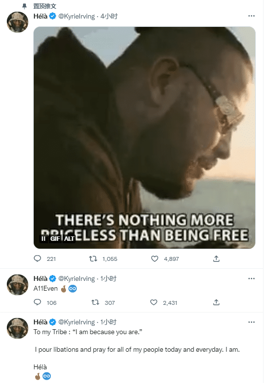 之后欧文连续发推,先是晒gif动图,图中写道:没有什么比自由更无价的了。