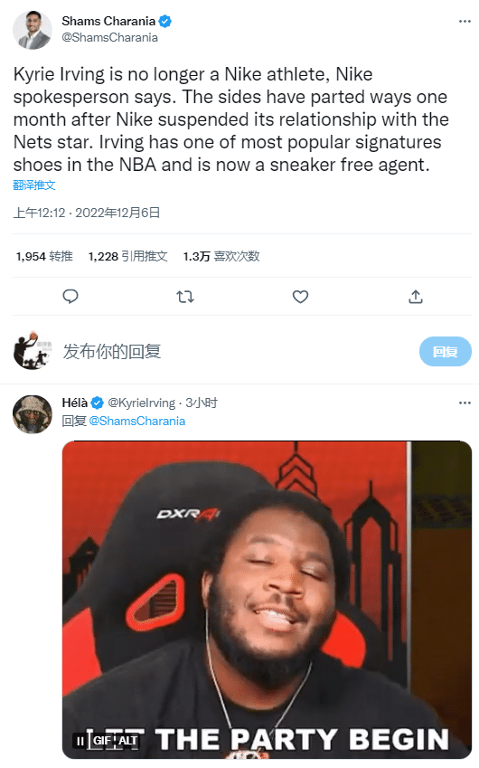 对于名记报道与耐克彻底分手,欧文本人回应shams:让这些报道开始吧。