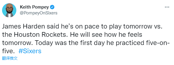 对于明天是否明天复出战火箭,哈登接受采访时表示:我距离在明天对阵火箭的比赛中复出仅一步之遥,明天,我会看一看感觉怎么样。