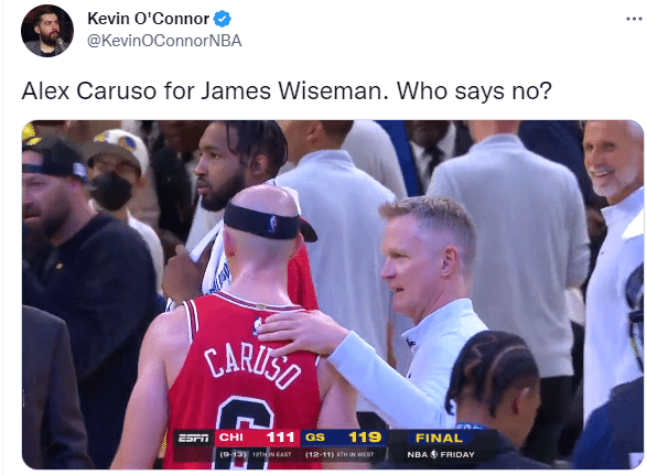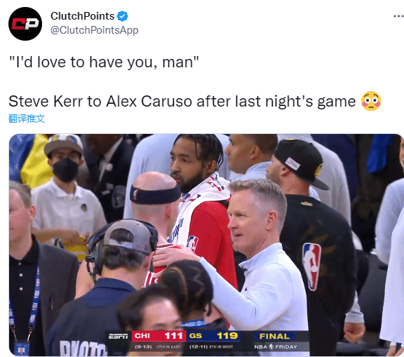 科尔毫不避讳地公开招募卡鲁索,表达对卡鲁索的喜爱并且坦言他很想在勇士执教他,名记kevin OCinnor发推写道:卡鲁索换怀斯曼,谁不同意?