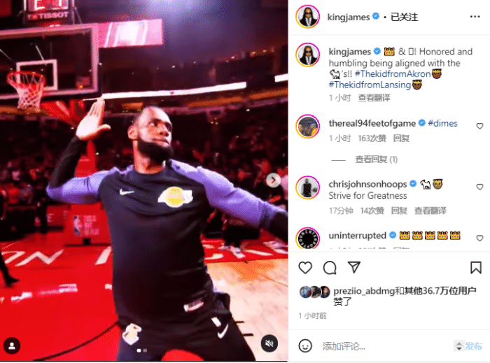 詹姆斯在Ins上转发自己和魔术师的传球集锦视频和超越魔术师纪录的庆祝照,配文写道:国王和魔术师,能被与GOAT们相提并论,这令我感到荣幸和谦逊!#那个来自阿克伦的小孩#那个来自兰辛的小孩。