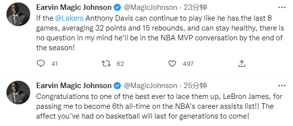 魔术师则发推写道:祝贺历史最佳球员之一勒布朗-詹姆斯超越我,在NBA历史总助攻榜上升至第6!你对篮球界造成的影响将持续几代人。