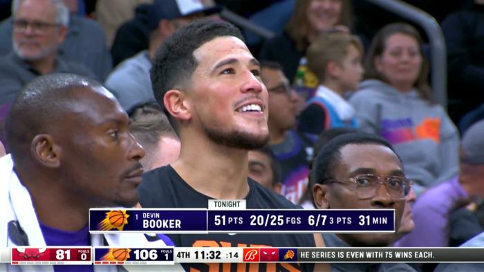 布克三节投进6记三分狂砍51分,带队打爆公牛,由于太阳领先优势太大,布克末节不再上场,三节打卡下班;坐在替补席,布克满脸笑容十分开心。