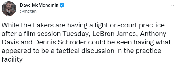 据湖人记者Dave McMenamin报道,湖人今日在录像会议后进行了一些低强度训练,随后他发现詹姆斯、戴维斯与施罗德在训练场附近开会讨论战术;他们之间进行了一番激烈交流,詹姆斯边说话边做出一些手势,说着说着,施罗德走向詹眉,做出手势发表自己的看法。