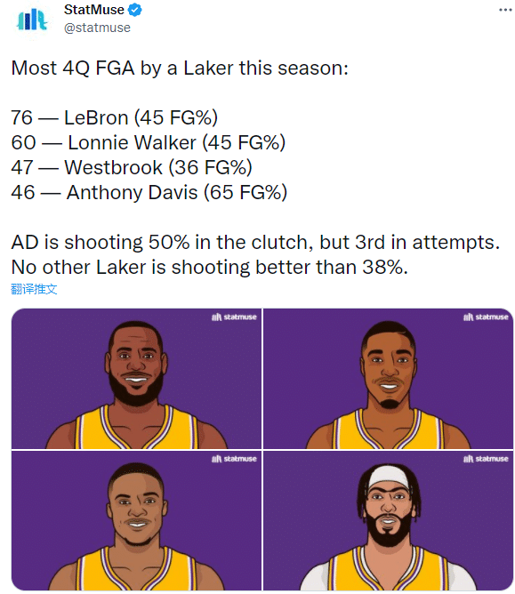 本赛季,湖人球员在末节的出手情况是詹姆斯76次(命中率45%)全队最多,朗尼-沃克60次(命中率45%)、威少47次(命中率36)和浓眉46次(命中率65%);另外浓眉在关键时刻投篮命中率为50%,其余湖人球员没有能高于38%的,但浓眉的关键时刻出手次数仅排队内第三。