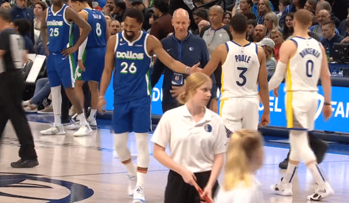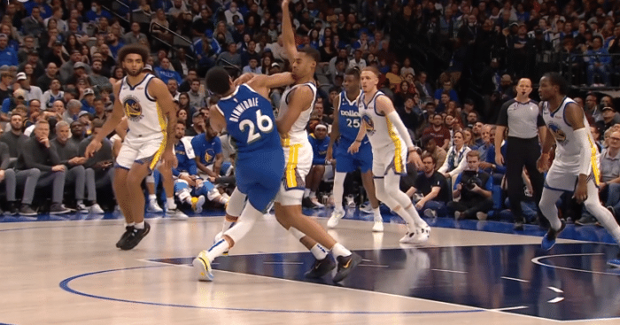 来源:JRS直播网11-30 13:25JRS直播网11月30日,NBA常规赛独行侠对阵勇士,第四节场上发生意外事件,丁威迪肘击普尔的下巴吃到二级恶意犯规,直接被驱逐离场。