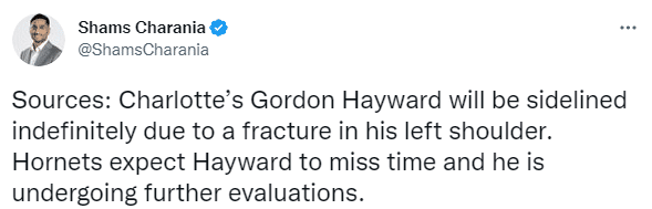 来源:JRS直播网11-26 11:16JRS直播网11月26日,夏洛特黄蜂又有坏消息,据名记shams报道,黄蜂球员戈登-海沃德因左肩骨折无限期休战,预计会缺席一段时间,他将接受进一步的伤情评估。