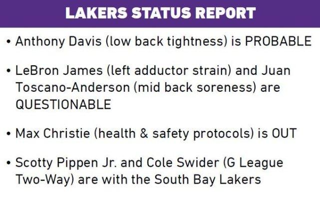 来源:JRS直播网11-20 19:36JRS直播网11月20日,湖人官方公布了最新的伤病报告,詹姆斯(左内收肌拉伤)和托斯卡诺-安德森(背部酸痛)的状态同为出战成疑(questionable,50%上场可能),浓眉(腰部紧张)的状态是大概率出战(probable,75%上场可能)。克里斯蒂触发健康安全协议,继续休战。小皮蓬和斯维德仍在G联赛的南湾湖人效力。
