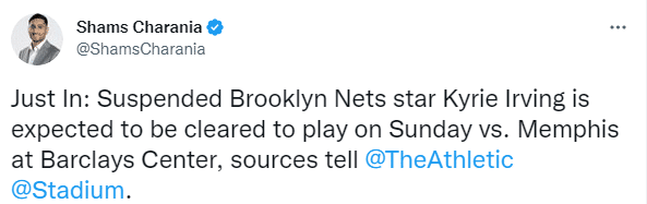 欧文因被禁赛将缺席篮网与开拓者的比赛,这是欧文被禁赛的第8场比赛,如今名记shams报道,欧文将在下周一复出,并且透露欧文完成归队条件的内幕。