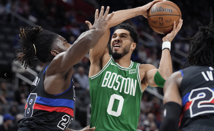 下半场,塔图姆第三节开启进攻模式,上场10分钟8投5中独砍15分3篮板,单节投进3记三分,带队单节34-24净胜10分;末节塔图姆早早上场,强突以及造杀伤继续得分,迎射艾维后做出“你太小”的嘲讽手势,反击助攻格威暴扣,当活塞连中三分反击时,塔图姆立即回应三分,再加上斯玛特抢断反击,绿军稳住局面。