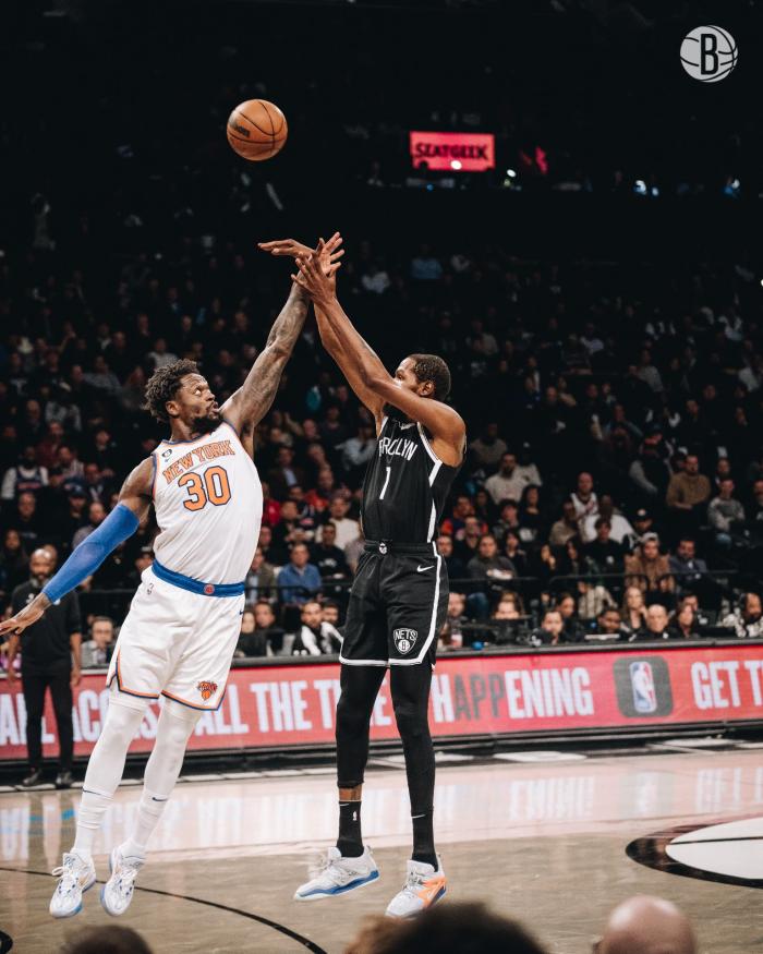 下半场,篮网第三节的进攻明显下滑,尼克斯趁机追分;期间杜兰特多次急停干拔得分,杜兰特还在防守端大帽巴雷特,第三节最后阶段,篮网稳住局面,三节打完篮网领先21分,杜兰特单节独砍12分。