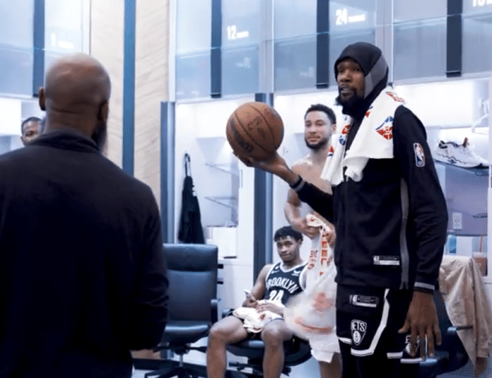 篮网更衣室庆祝曝光:全队欢呼杜兰特恭喜主帅 西蒙斯穿浴巾太抢镜