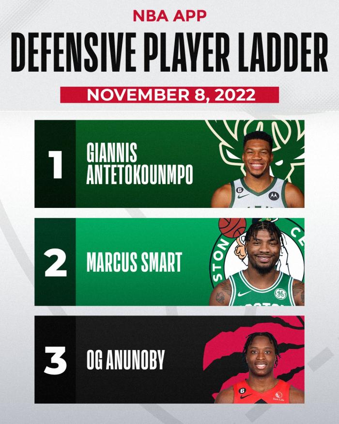 字母哥力压斯玛特和阿奴诺比领跑最佳防守球员实力榜,另外上榜的7名球员分别是阿德巴约、太阳队布里奇斯、雷霆队多尔特、鹈鹕队赫伯特-琼斯、大洛佩兹、骑士莫布里和快船祖巴茨。