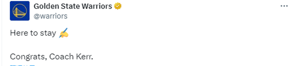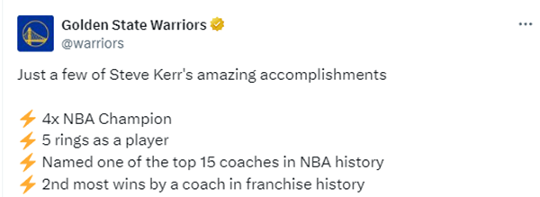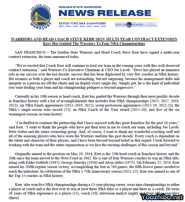 勇士官宣正式与科尔续约,官方晒海报并且写道:恭喜,主教练科尔。勇士官推还列出科尔生涯的一些伟大荣誉——4次NBA总冠军、作为球员5次夺冠、NBA历史15大主帅之一以及队史执教胜场第二多的主教练。