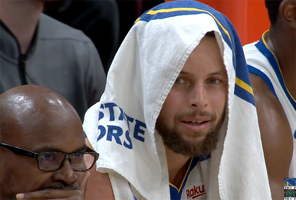 下半场,库里第三节命中三分终于开张,单节4中2贡献8分,再加上克莱单节13分爆发,勇三疯又来了,单节38-17打爆奇才;末节面对奇才的反扑,克莱率先续上火力,之后库里三分频频打铁后两次杀到禁区,打着打着,三分终于再次命中,库里提前打卡,坐在替补席面露笑容,最终勇士拿下比赛,库里末节10中4拿到10分。