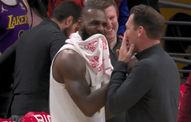 湖人输球后:詹姆斯和湖人旧帅有说有笑 满脸笑容与乐福寒暄