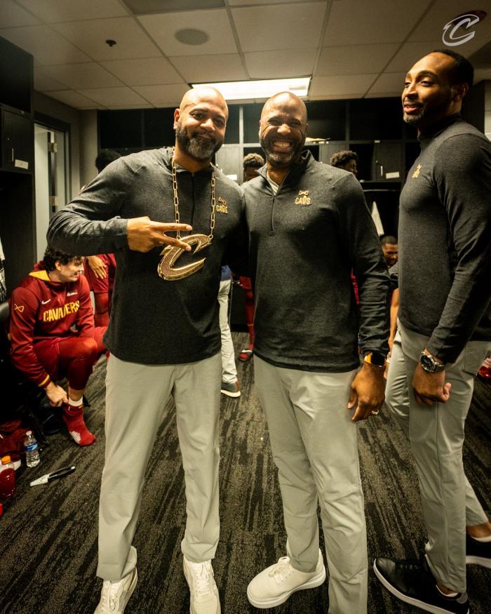 在骑士更衣室内,乐福率领全队偷偷地将象征着全场最佳的大金链颁给了主教练比克斯塔夫,乐福为主帅戴上大金链子,加兰、乐福等全队球员都围着主帅呐喊、欢呼;骑士全队合影留念,加兰露出发狠表情,米切尔和主帅一样抱着双臂,现场氛围太棒了。