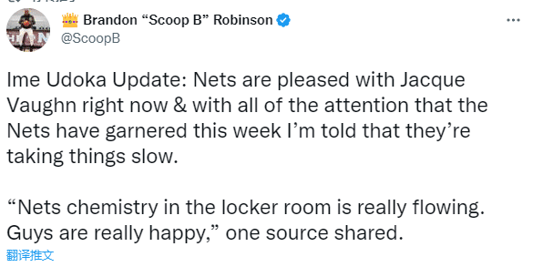 据美记者Brandon Robinson报道,现在篮网对雅克-沃恩很满意,而且篮网本周因欧文场外事件受到外界的关注,他们已经放慢了选帅进展;消息人士透露,现在篮网更衣室的氛围非常好,球员们都非常开心。
