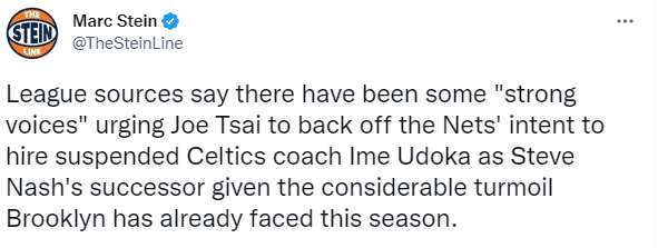 据名记Marc Stein报道,联盟消息源称,鉴于篮网本赛季已经有相当大的动荡,有一些“强烈的声音”敦促蔡崇信放弃聘请乌度卡担任主帅的打算。