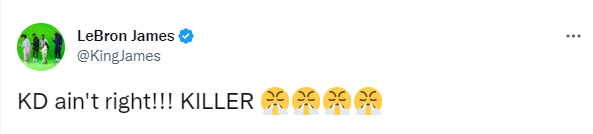 杜兰特关键时刻的表现引热议,詹姆斯第一时间发推写道:你永远可以相信杜兰特!!!杀手。