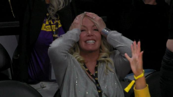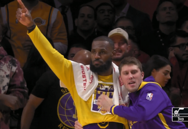 下半场,湖人第三节一度落后到16分,先是詹姆斯和浓眉带队追分,威少上场后助攻詹姆斯扣篮,外线轰进三分,空接上篮,此时威少满脸笑容打开心了以及秀肌肉庆祝;威少强杀到篮下再次得分,威少造犯规两罚全中,罚球时现场球迷为威少高呼MVP,湖人美女老板珍妮-巴斯也开心了,威少带队11-2反扑,詹姆斯也兴奋地坐不住了。