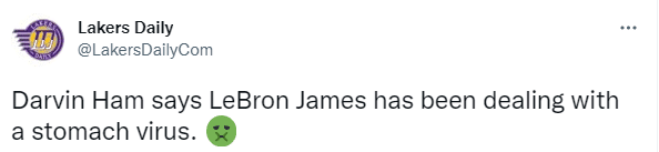 究竟詹姆斯怎么了?哈姆透露詹姆斯一直在与肠胃病作斗争;此前詹姆斯曾透露他生病了,并且错过了球队的万圣节派对;换言之,詹姆斯正遭遇胃病的困扰;另外詹姆斯一直带伤作战,左脚酸痛一直都在湖人伤病名单上,这也是影响他的爆发力的原因之一。