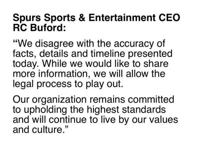 在Shams的报道中,Cauthen称其在2022年1月就向马刺举报了普里莫的行为,但她的多次举报遭到了马刺方面的“无视”。对于Cauthen方面的起诉,马刺CEO布福德也第一时间发声明回应:“我们不同意今天提出的时间、细节和事实的准确性,虽然我们愿意分享更多信息,但我们会通过法律程序来进行。我们球队仍然忠于维护最高标准,并将继续遵循我们的价值观和文化。”