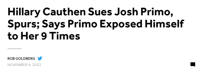 来源:JRS直播网11-04 20:13JRS直播网11月04日讯 ,据名记Shams报道,前马刺心理专家Hillary Cauthen已经就普里莫涉嫌不雅暴露的事件起诉马刺和普里莫。Cauthen称,从2021年12月开始,普里莫曾9次向她暴露身体,而马刺队在此期间没有采取任何措施。