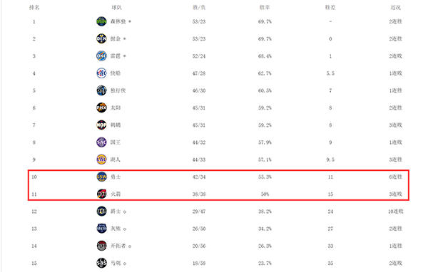 目前勇士42胜34负排名西部第十,火箭38胜38负,西部第11名。