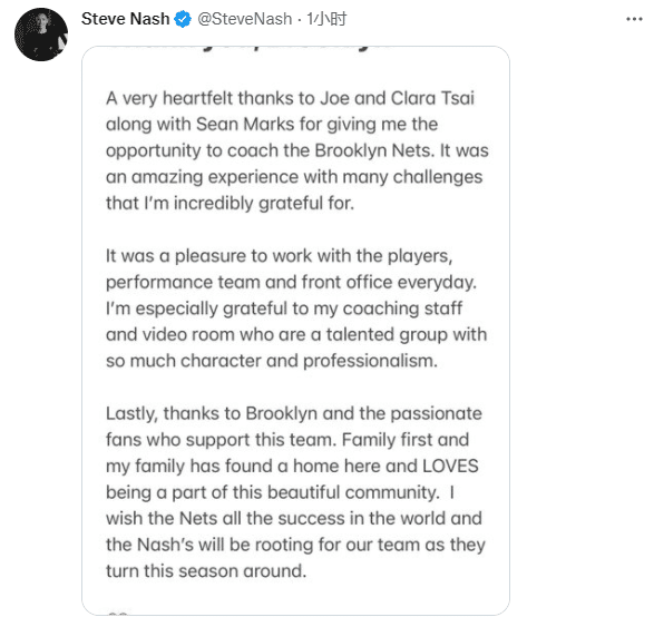 纳什声明:我非常感激蔡崇信夫妇和肖恩-马克斯给予我执教篮网的机会。这是一段非常奇妙的旅程,我经历了许多挑战,我对此非常感激。