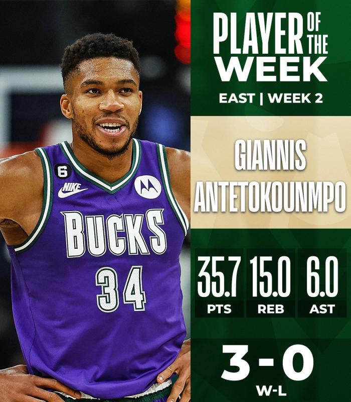字母哥也是赛季首次当选,生涯第18次夺得周最佳,雄鹿官方第一时间恭喜字母哥获奖;赛季至今,字母哥场均轰下34.4分14篮板5.8助攻1.6盖帽,场均得分和篮板都排名联盟第二,雄鹿5胜0负排名东部第一。