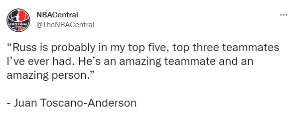 湖人球员安德森盛赞威少,他表示:威少可能是我职业生涯中排名前五、甚至前三的队友,他是一个了不起的队友,也是一个了不起的人。