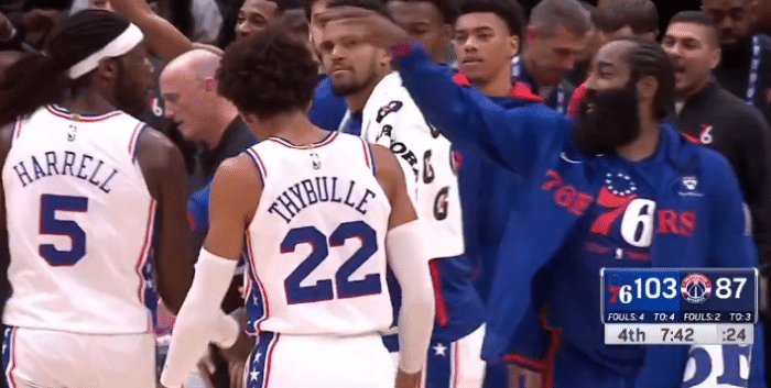 末节马克西和尼昂输送火力,76人替补阵容顶住了奇才的反扑,7分43秒,尼昂再中三分时,哈登从替补席站起来,咧嘴大笑和队友击掌庆祝;比尔继续带队追分,哈登连续助攻梅尔顿稳住局面,关键时刻哈登再次助攻梅尔顿,哈里斯关键三分,最终76人拿下胜利。