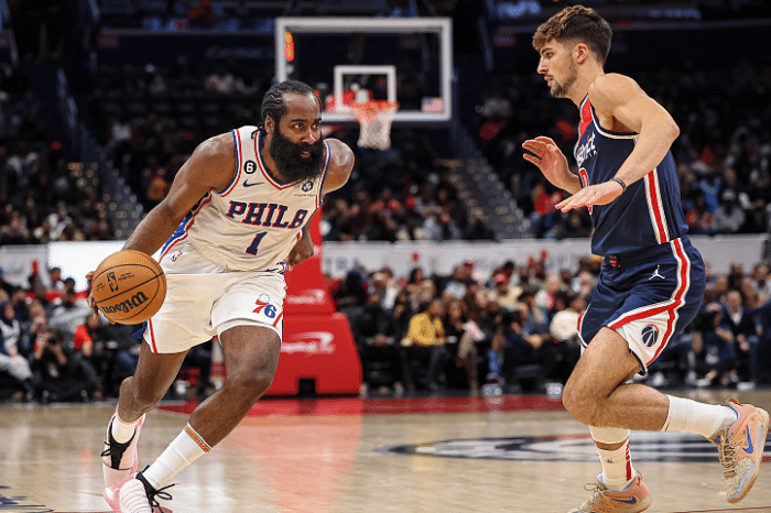 首节比赛,哈登开场抛投得分,哈登助攻塔克连得4分,又助攻马克西得分,助攻塔克投进三分,76人开场与奇才展开对攻大战,两队的命中率都很高;哈登持球挑战2米21的波尔津吉斯,无惧防守打成2+1,哈登摔倒磕到手肘并且破皮流血,哈登接受治疗后继续比赛。