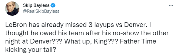 首节比赛,詹姆斯上场9分钟5投1中仅仅按到2分,得分来自于和威少连线,老詹双手暴扣得分;第一节4次上篮不进,更扎心的是詹姆斯上篮惨遭篮筐拒绝,难道勒布朗真老了吗?名嘴Skip第一时间发推写道:詹姆斯这场大掘金已经4个上篮没进了,他是觉得自己因为上一次打掘金玩消失亏欠球队吧???国王,近来可好???你也不得不服老了?