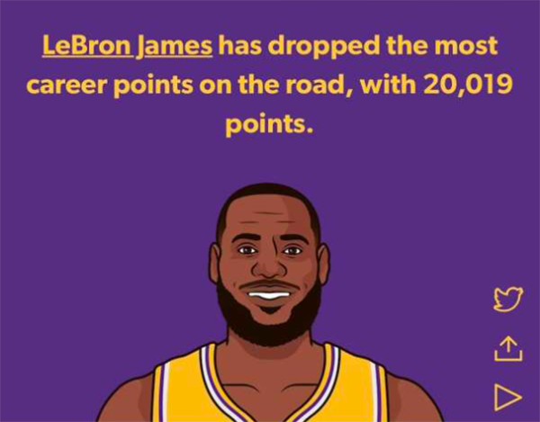 据美媒StatMuse统计,到目前为止,詹姆斯生涯在客场比赛的总得分为20019分,成为NBA历史上首位客场取得20000分的球员,NBA名宿贾巴尔以生涯客场19047分排名历史第二。