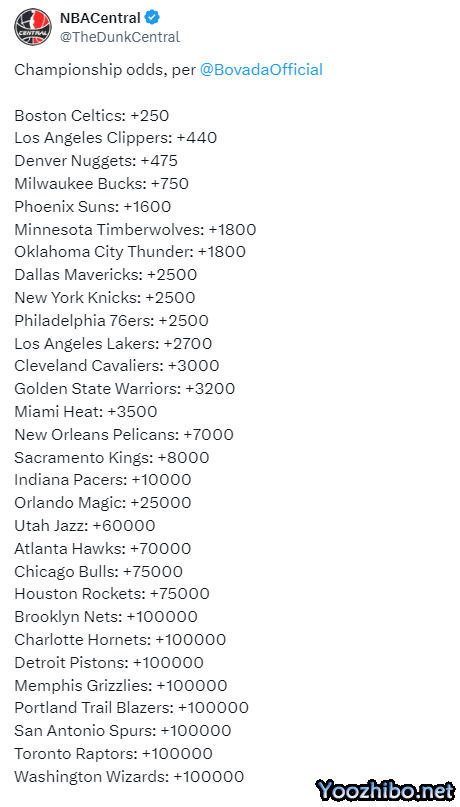 最新夺冠赔率的具体情况——1、凯尔特人+250;2、快船+440;3、掘金+475;4、雄鹿+750;5、太阳+1600;6、森林狼和雷霆+1800;8、独行侠、76人和尼克斯+2500;11、湖人+2700;12、骑士+3000;13、勇士+3200;14、热火+3500;15、鹈鹕+7000;16 、国王+8000;17、步行者+10000;18、魔术+25000;19、爵士+60000;20、老鹰+70000